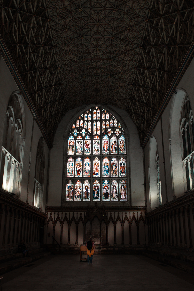 Chapter House是英格兰最大的一座牧师会礼堂, 半圆拱形的屋顶用爱尔兰橡木制成, 装饰极具英国晚期哥特风格特色. 东西两头的花窗制作于维多利亚时代后期, 其中东头花窗描绘的是与坎特伯雷大教堂发展历史关系最为密切的人物。